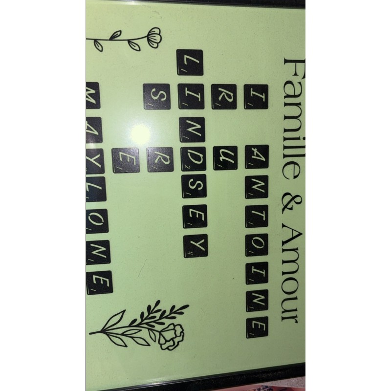 Un cadre « Scrabble » sur le thème famille avec les prénoms des enfants et des parents. J’en suis ravie. Mélody est une personne à l’écoute de chacun de nos projets. Je recommande à 1000%. Et je recommanderai avec plaisir d’ici peu !